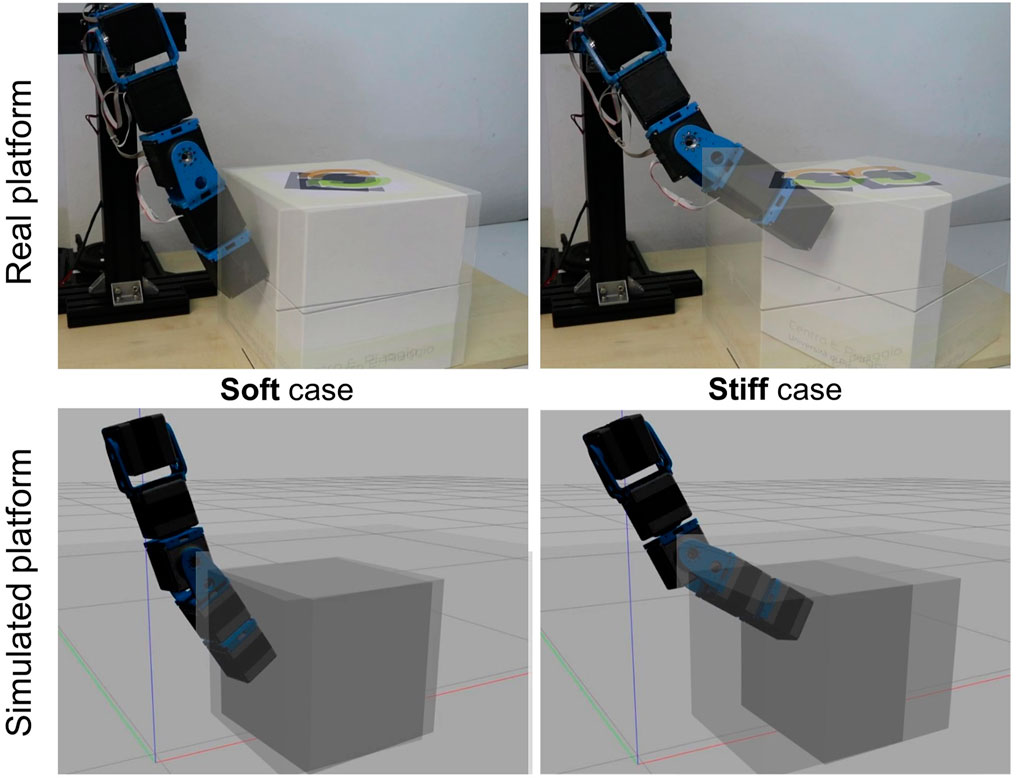 FIGURE 14. Experimental and simulated validations of the stiffness reproduction with the proposed ROS-Gazebo toolbox in case of an interaction task with a box of 2 kg weight. The right-hand side figures show the behavior in the soft scenario, while on the left-hand side the stiff case is reported. In the former case both the experimental and the simulated platforms are not capable to move the box, while if stiffened they can exert an increased force to the box able to move it forward.