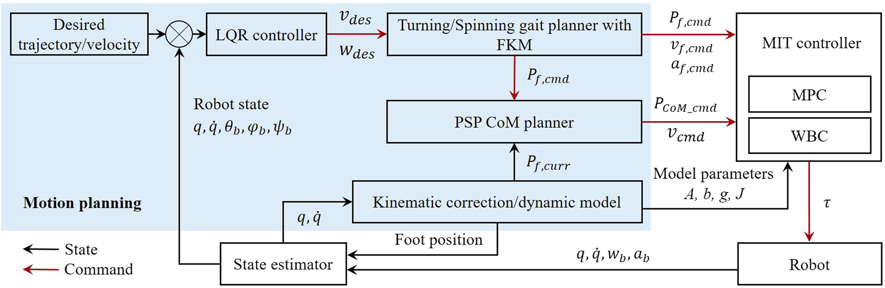 The control framework for the terrain-perception-free and accurate spinning movement of quadruped locomotion. The blue region highlights the work proposed in this study. MIT Mini Cheetah tracking controller functions as the low-level motion controller. A state estimator provides state measurements for the kinematics correction, LQR controller, and CoM trajectory planner. q and are the joint position and velocity, respectively. The robot states θb, φb, and ψb are the roll, pitch, and yaw angular of the body. ωb, ab are the angular velocities and linear accelerations of the body. The foot states Pf,cmd, vf,cmd, and af,cmd are the position, velocity, and acceleration commands, respectively. Pf,cmd, vf,cmd, ωb, and ab are elements of , where N is the number of foot contact on the ground.