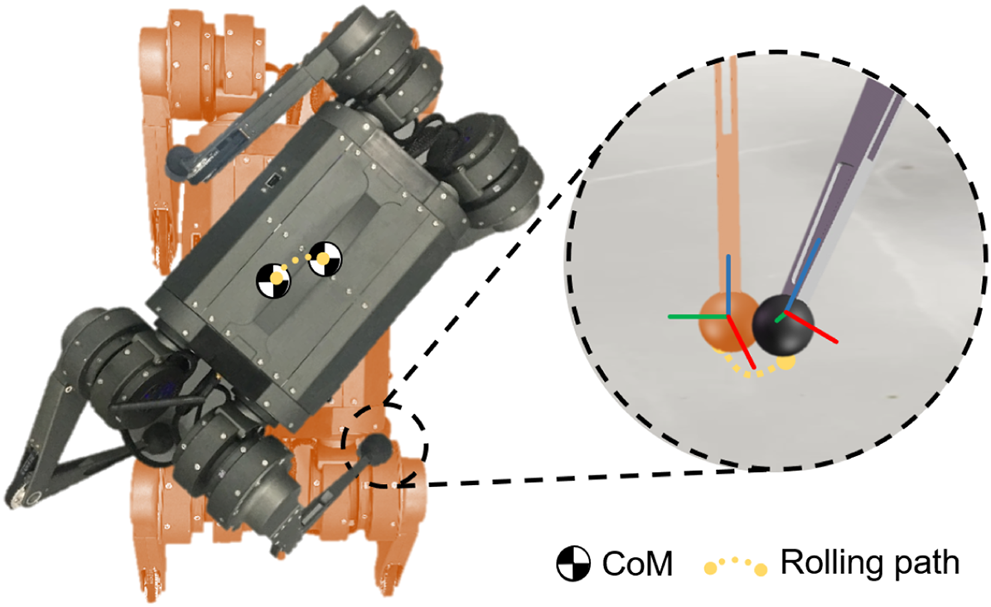 Since the foot-end effector of the robot is spherical, the foot-end effector rolls on the ground as the leg posture changes. For small-scale quadruped robots, the ratio between radius of ball foot and shank length is large. As a result, the large radius foot will change the contact point and CoM position as the robot spins around the yaw axis during the support phase as shown in Figure 2. This deviation is not negligible during a highly agile locomotion and the spherical contact engagement needs to be investigated and modeled.