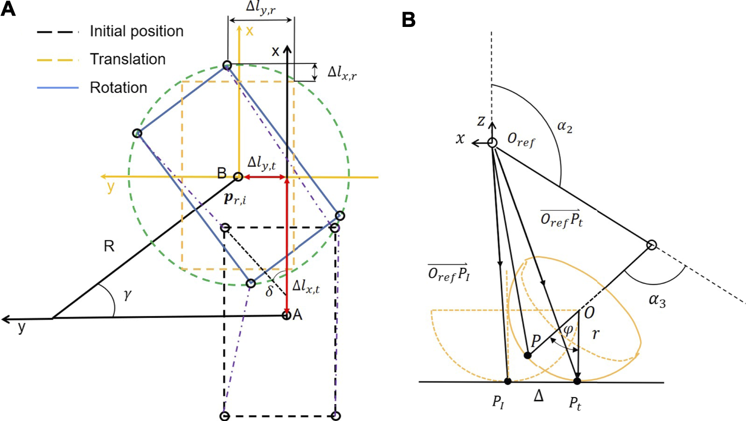 (A) Transformation process of the circling/spinning gait divided into translation and rotation. (B) The inverse kinematics for a leg with a spherical foot-end effector that rolls on ground during the support phase.