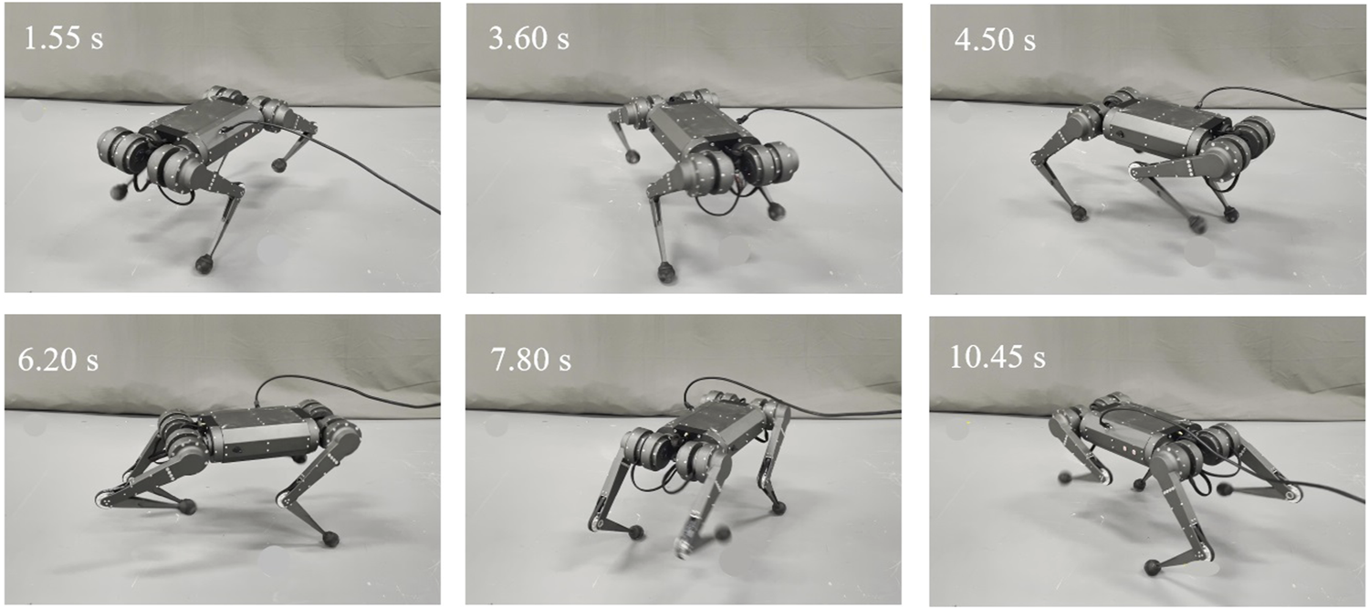 The above method is validated through comparative experiments. The robot is expected to spin at trotting gait on the flat ground. The velocity of the robot in the x and y directions is 0 m s−1. The angular velocity ω is 0.7 rad s−1. The gait planner, FKM, PSP CoM planner, and LQR controller are verified for spinning both on simulation and the quadruped platform. The experiment screenshots of the quadruped robot spinning on the flat ground are shown in Figure 5.