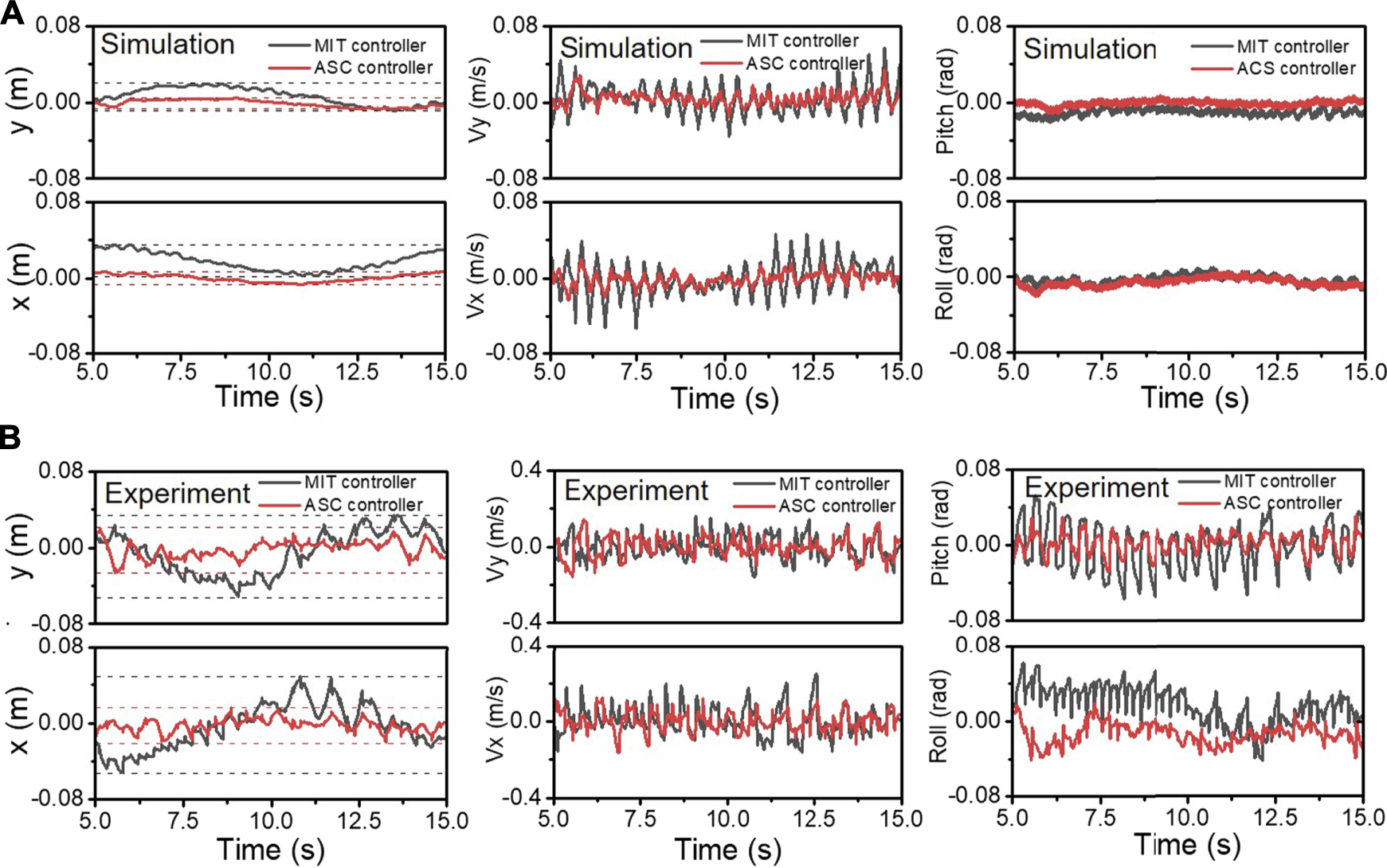 The CoM position, velocity, and attitude of body during spinning in simulation (A) and experiments (B) are recorded. The black and red lines represent the results of the MIT controller and our ASC controller, respectively.