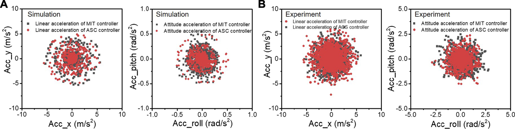 The linear acceleration and angular acceleration of the robot during spinning experiments in simulation (A) and the quadruped platform (B), respectively. The black and red lines represent the experimental results with MIT controller and our ASC controller, respectively.