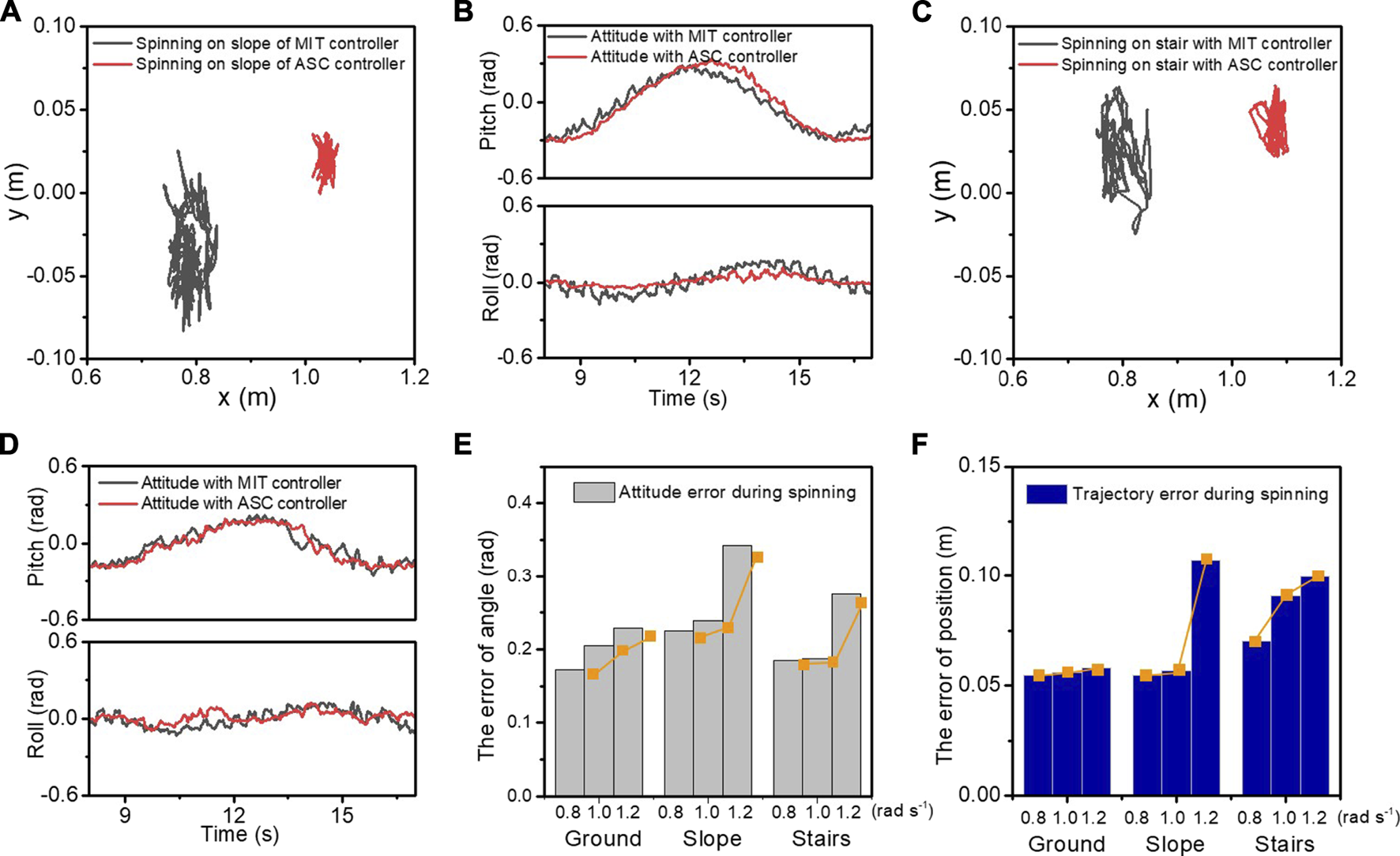 The CoM trajectory, the roll and pitch angles, the displacement, and velocity of the x and y axes in the experiment of spinning on the slope (A, B) and stairs (C, D). The black and red lines represent the experimental data with the MIT controller and our ASC controller, respectively. The statistical attitude errors (E) and trajectory errors (F) are recorded when spinning on different terrains with varied velocities of 0.8, 1.0, and 1.2 rad/s.