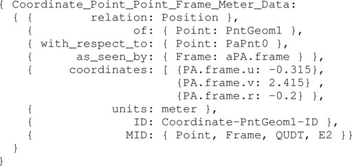 A mereo-logical7 model of a Point in two-dimensional Euclidean space (E2), with Semantic_ID metadata, is referred to as {Point: aPoint} (with “aPoint” the name for this Point entity), and represented in full as follows: