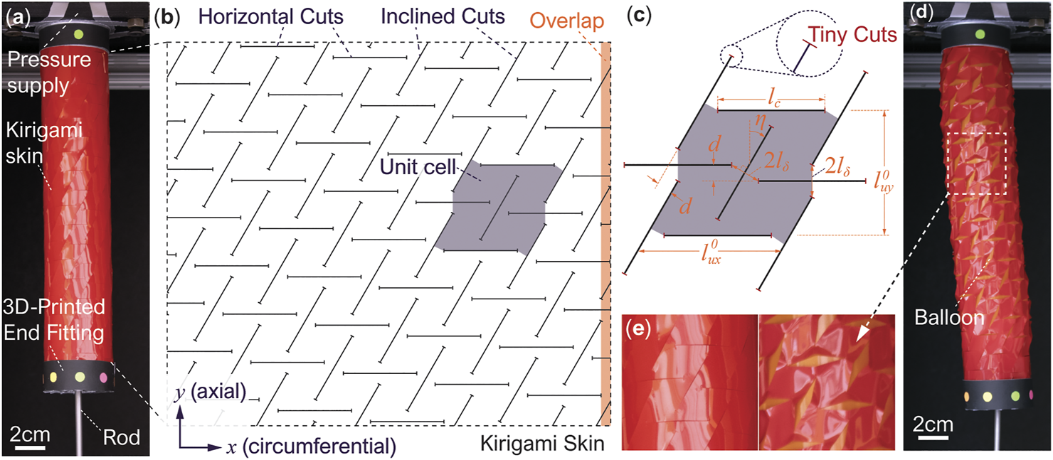 The offset between adjacent cuts are d = 2lδ sin η. Moreover, the number of unit cells Nx in the kirigami skin’s circumferential axis depends on the offset d, and it should roughly follow a geometric constraint: