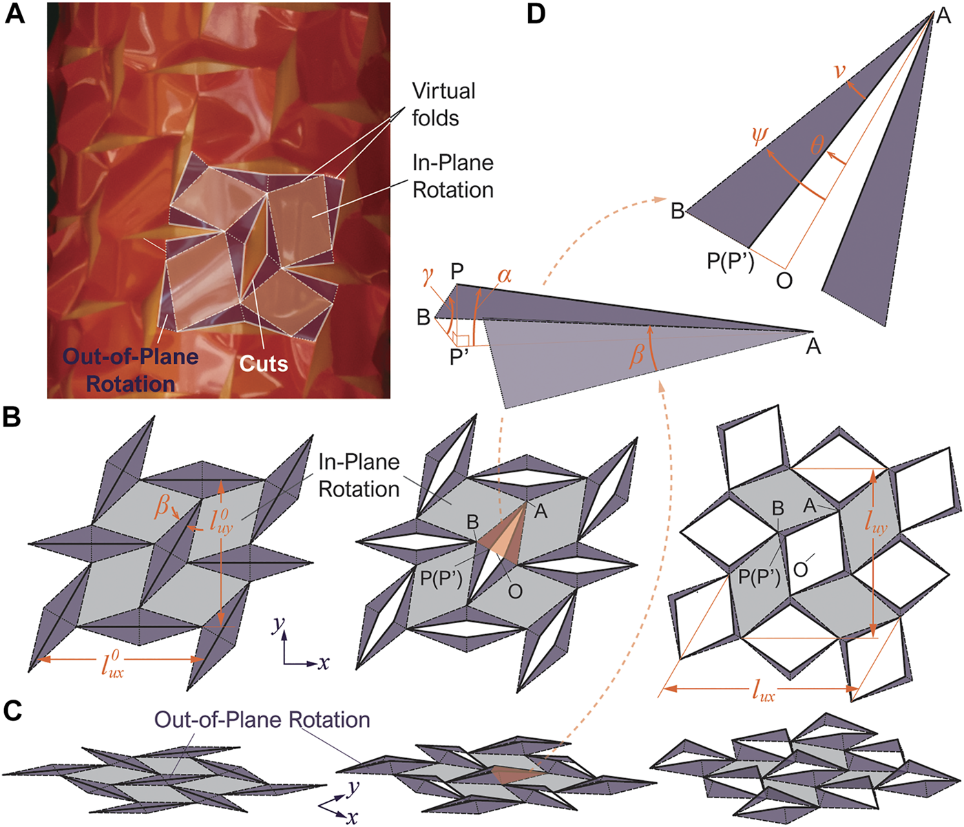 Here, two angles can describe the rigid-body rotations of this triangular facet. They are the sector angle of the projected triangular facets ν = ∠P′AB, and the opening angle of the kirigami slit cuts θ = ∠OAP’, where O is the center point of the opened slit cut. Note that if the kirigami skin is un-deformed, the triangular facet ABP lays on the reference plane so that ν = β and θ = 0°. Once the kirigami skin deforms out-of-plane, one can apply the law of sines and obtain