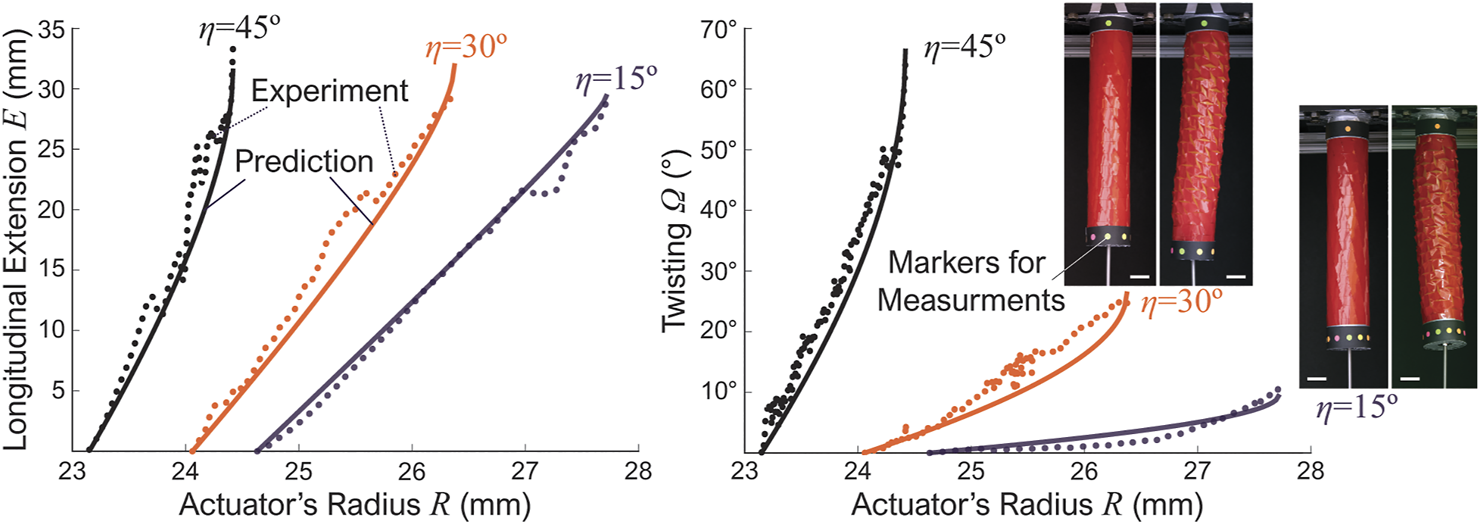 FIGURE 3. Experiment results from three kirigami-skinned actuator prototypes with different incline angles η. The dotted lines are readings from the experiment and solid lines are the kinematics model predictions. The scale bars in the pictures are approximately 2 cm.