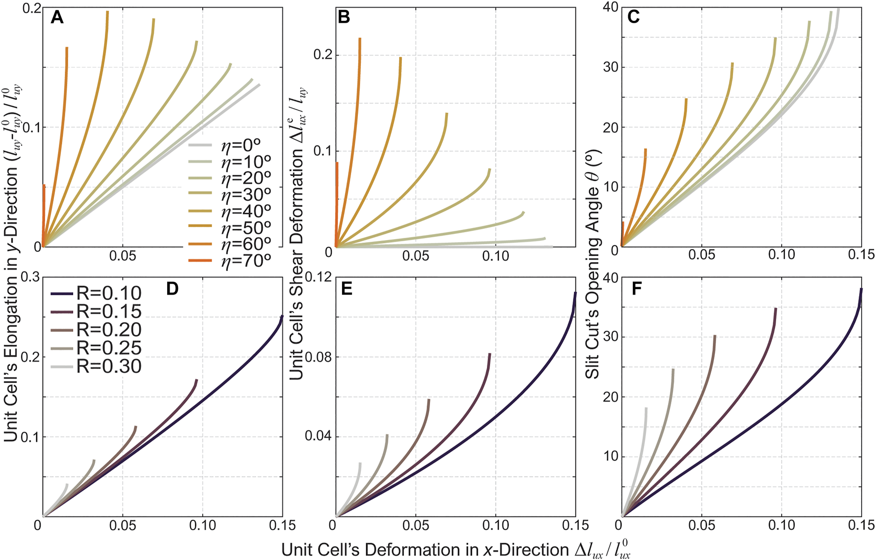 However, when the incline angle η is not zero, two changes occur. First, the unit cell’s expansion becomes anisotropic, and in particular, the cell deforms more in the circumferential x−axis than in the axial y-direction so that its aspect ratio changes. We denote such “excessive” deformation in the x−axis as