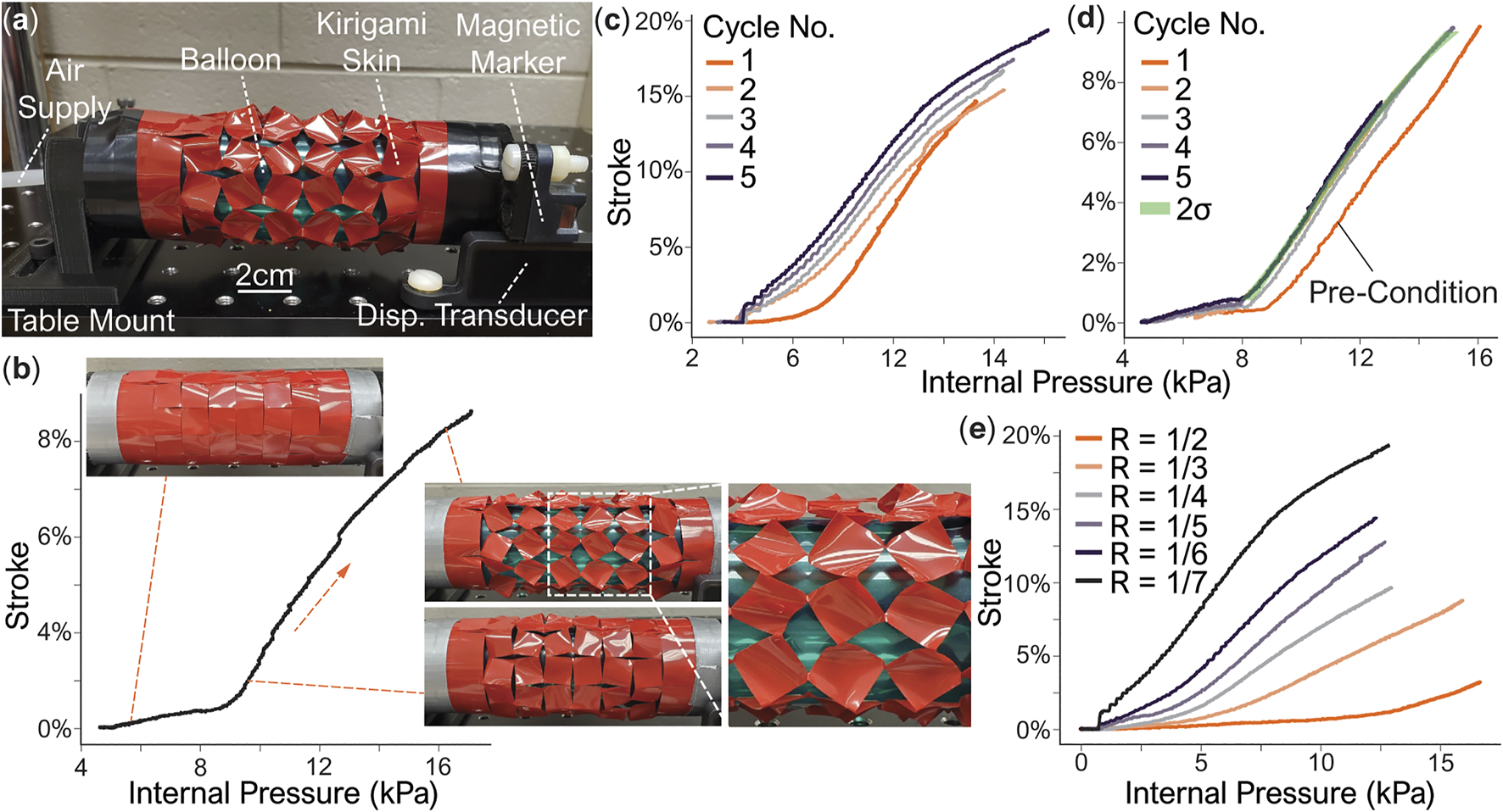 FIGURE 5. Free stroke testing results from the kirigami-skinned actuators. (A) The test setup. (B) A pressure-stroke curve of a prototype with R = 1/6 and the corresponding skin deformation pattern. The two deformation phases are evident. (C) Cyclic loading responses from this prototype. Each loading cycle achieves a higher stroke than the previous one. (D) Another cyclic loading result. In this case, the prototype is pressurized to 10% stroke in the first pre-condition cycle, and then used with a smaller stroke in the subsequent cycles. The standard deviations of Cycles 2-5 are highlighted, showing a repeatable performance. (E) The measured performance of actuator prototypes with different cut ratios. Experiment images adapted from Ianucci and Li, 2020 with permission.