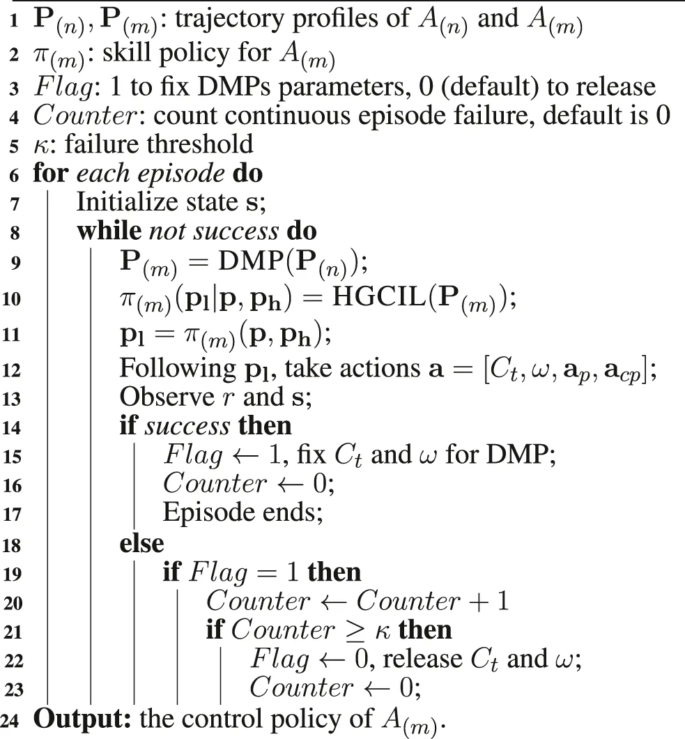 ADMP works in the trajectory learning part. It keeps constant after finding a seemingly suitable nominal trajectory of A(n) with a small amount of trial and error, and then the framework only updates the parameters of the controller for the force learning at each training step. If the learning performance is constantly poor with the current after certain steps, ADMP will be updated again with a given frequency to search for an alternative . This mechanism is represented by the switch symbol in Figure 1. The whole modular learning process is shown in Algorithm 1.