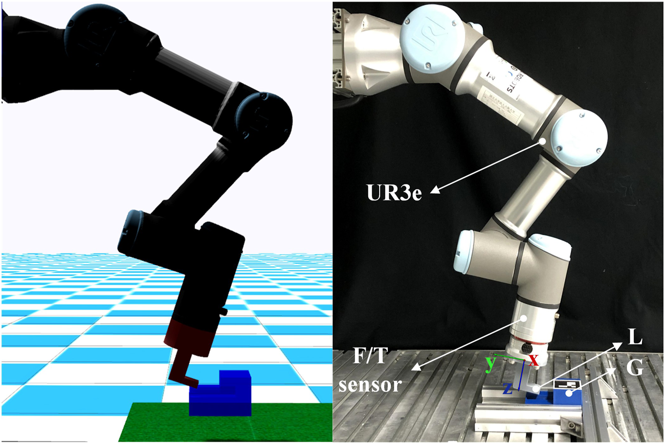 The simulated environment in Gazebo and the real experiment environment with a UR3e robotic arm. We show the setup for A(2) task where L is directly attached to the robot.