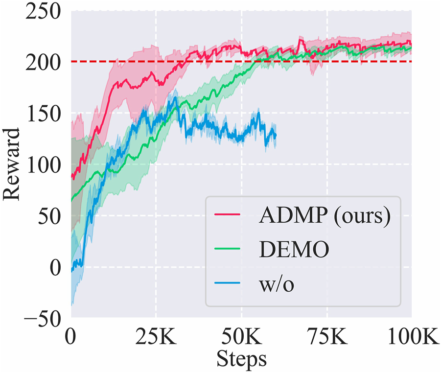 Among these methods, ADMP showed the highest sample efficiency of 40 K steps, even higher than the baseline DEMO (55 K), and the learning result of ADMP was also as good as the DEMO. Although the better performance of ADMP than DEMO may result from suboptimal demonstration, this result indicated that introducing the DMP component into our framework was indeed effective in adapting to new tasks and alleviating human demonstration burden, and the sample efficiency was at least not lower than using demonstrated trajectories of new tasks.