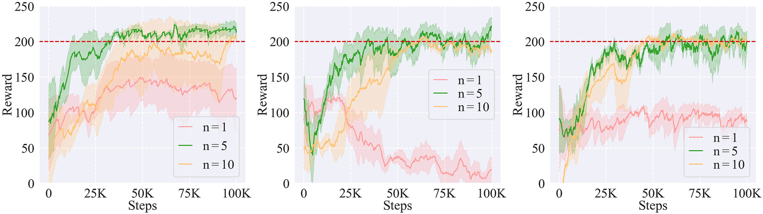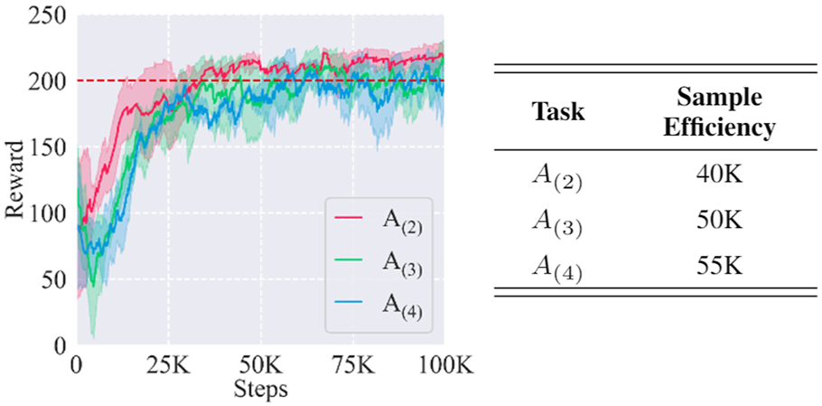 Learning curves and sample efficiencies of task instances A(2), A(3), and A(4). The red dashed line represents the near-optimal reward.