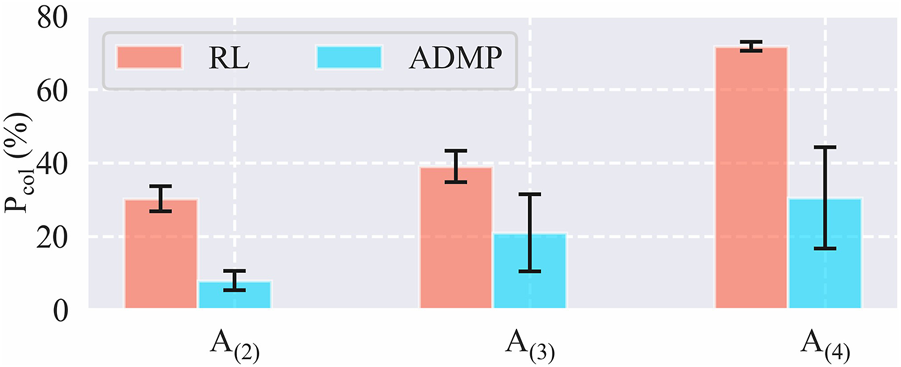 Finally, we compared the collision percentage during the training sessions of each task using frameworks with and without ADMP as shown in Figure 8. Five training sessions were implemented for each pair of task and framework, and the collision percentage of each training session, Pcol, is calculated by: