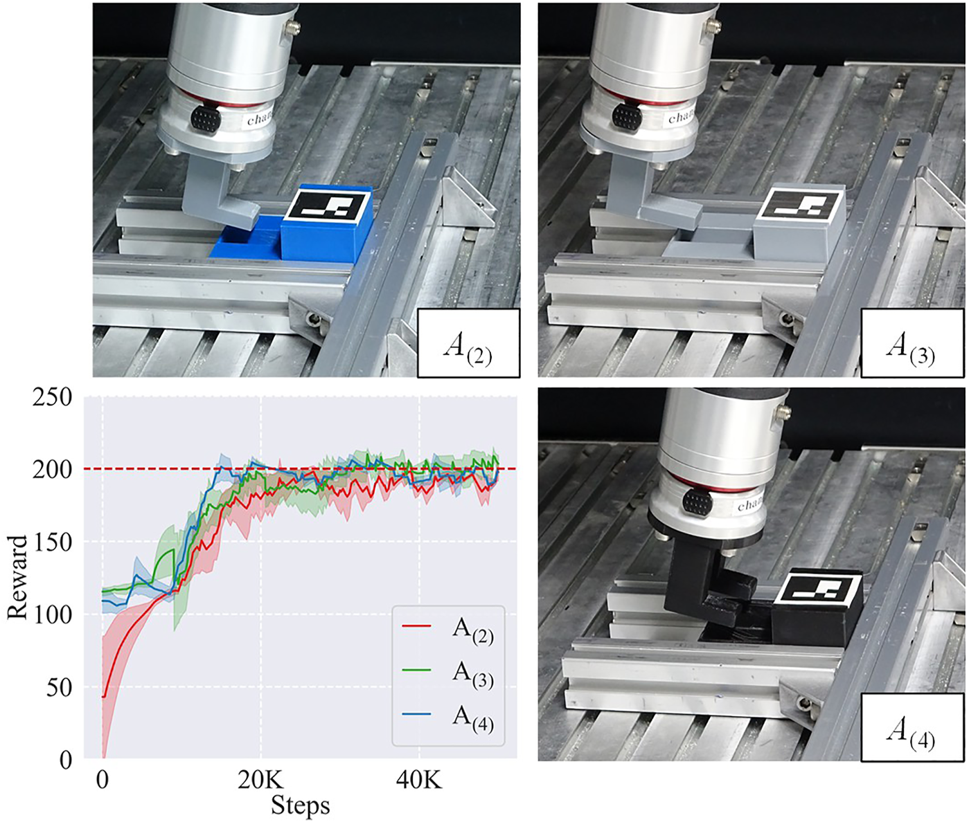 Sim-to-real tasks A(2), A(3), and A(4) and their learning curves. The L objects are directly attached to the robot.
