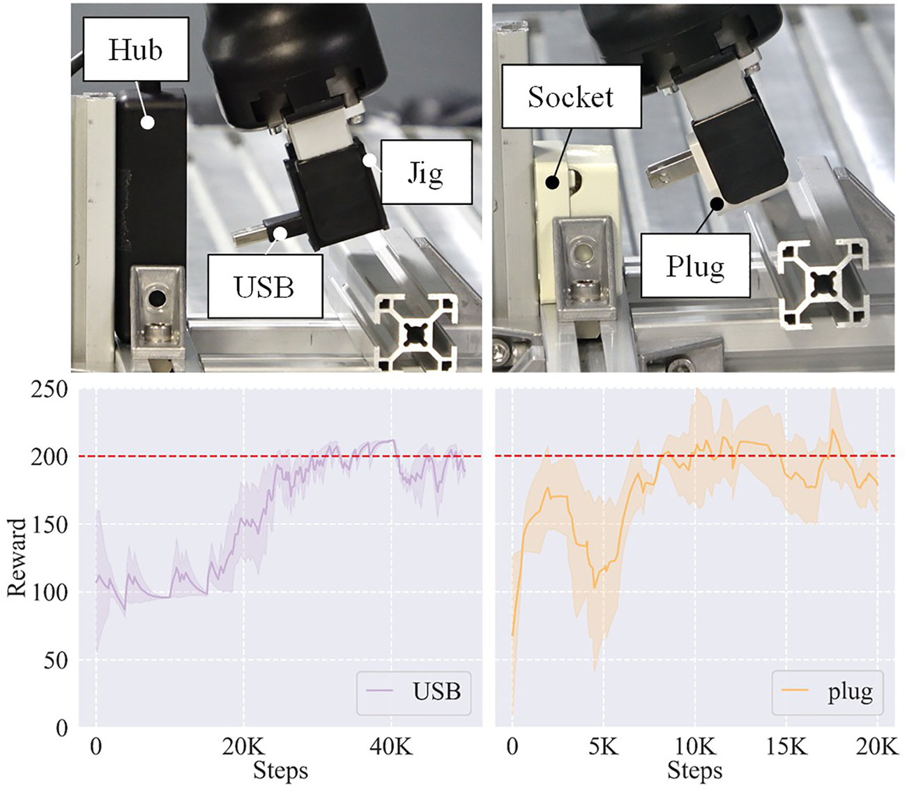 We then utilized two real assembly tasks, a USB insertion task and a plug insertion task, to further validate the generalizability of the framework. As shown in Figure 10, the USB and the plug were grasped by the gripper. We assumed that they were in stable poses so that their positions did not change too much during the training sessions. Considering the contact area, we added a jig between the USB and the gripper to improve the stability in case that the friction was not enough to resist the contact force. As for the plug, we did not utilize a jig. A structural aluminum profile played the role of an obstacle to prevent the USB or the plug from inserting into the hub or the socket directly in each task, so that the EEF had to adopt a trajectory like the L insertion to finish the task. Figure 10 also shows their learning curves. It took the framework about 30 K steps and 10 K steps to learn these two tasks, respectively. We analyzed that the difference between the sample efficiencies of different tasks resulted from their different trajectory proximity to the initial trajectory—the trajectory of the plug insertion was more similar to the original demonstrated trajectory of the L insertion so that the learning process was faster. Note that we utilized a jig in the USB insertion to reduce the slip between the object and the gripper but not in the plug insertion. This is why the performance dropped at about 3 K steps in the plug insertion while the performance of the USB insertion kept improving.