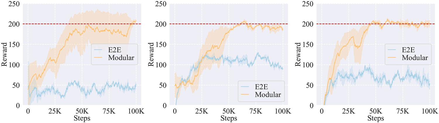 In the proposed framework, we use a modular learning strategy because end-to-end learning can become very inefficient and even fail as networks grow (Glasmachers, 2017), which is known as the curse of dimensionality. In contrast, structured training of separate modules may be more robust. Moreover, assembly tasks are naturally divided into different subtasks that can be learned in different modules, e.g., in our problem setting, a task can be divided into a trajectory learning part and a force learning part. Therefore, we introduce DMPs into the framework in a modular learning fashion expecting to overcome the curse of dimensionality.