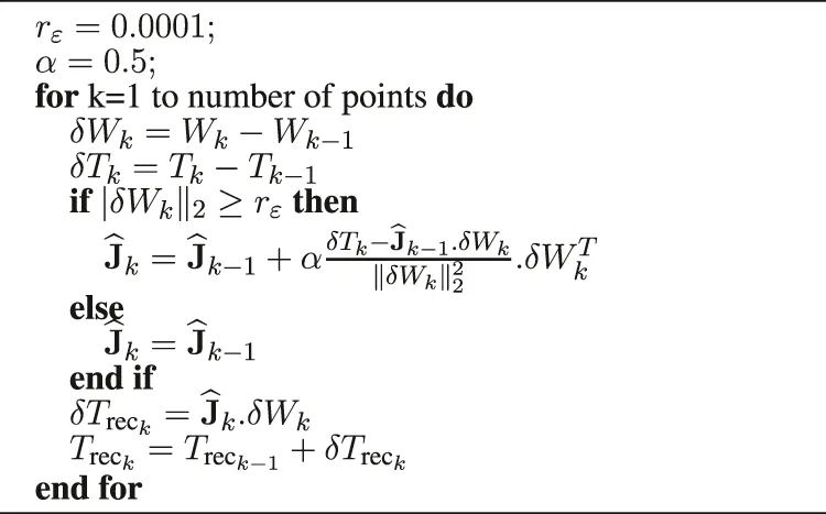 The problem stated above is a nonlinear optimization problem since the matrix J depends on the position W and the unknown environment. In the literature, the most common numerical method to solve this kind of problem is the Newton method. More particularly, when it is necessary to estimate a Jacobian matrix, the Broyden method is used. This is an iterative method that can be used to estimate the Jacobian matrix (Mansard et al., 2006) of a robot. This method uses an initial guess to generate an improvement sequence of approximate solutions. It gives good results assuming that the initial value is not too far from the actual value. In addition, this method has a low computational cost that allows for online estimation.