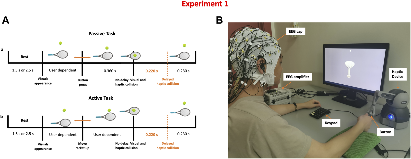 Detecting the presence of haptic delay experiment (A) Task time-line of a single trial under the passive and active haptic interactions (B) Experimental setup showing a participant correctly holding the stylus to control the racket shown on the screen. Synchronous and delayed haptic feedback are delivered through the stylus.