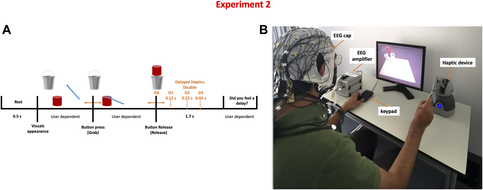 Detecting the level of haptic delay experiment (A) Task time-line of a single trial where four possible delay levels can be perceived (B) Experimental setup showing a participant correctly holding the stylus to pick up and carry the object.