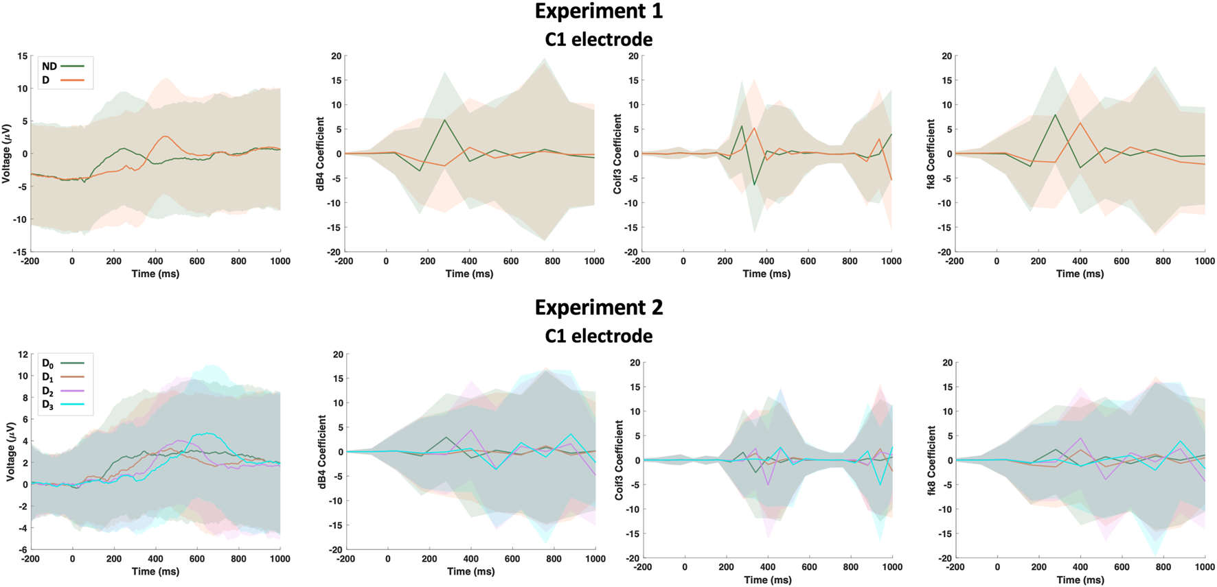 A sample of the dataset showing the raw EEG data and its wavelet transform based on Daubechies-4 (dB4), Coiflet-3 (Coif3) and Fejér-Korovkin-8 (fk8) wavelets for C1 electrode. Hard lines show the mean of the trials while shaded regions shows the standard deviation.