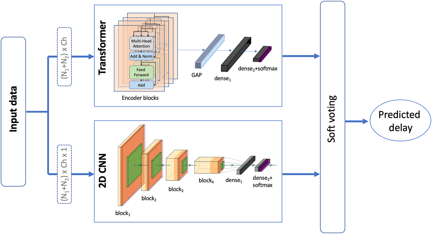 An ensemble model consisting of both, the 2D CNN and the transformer models is also examined. The output of both models is combined in a soft voting manner such the probabilities of each class are averaged and the predicted delay is based on the class with the highest probability. Soft voting considers each voter’s degree of certainty rather than just their binary input. The proposed ensemble model is depicted in Figure 4. This model was examined and tested for both experiments with the only difference being in the size of the final dense layer of the transformer as well as the 2D CNN model.