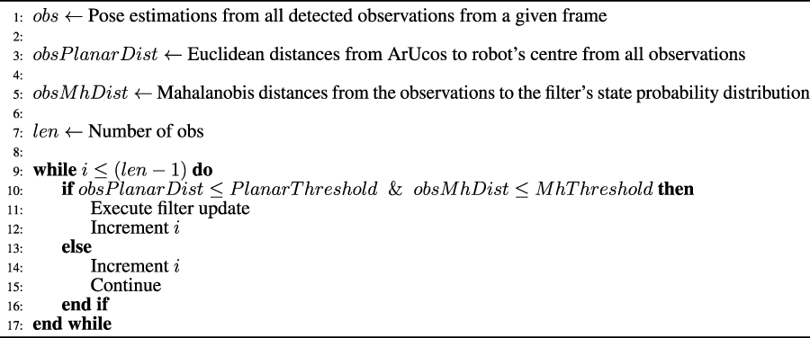 To better understand how the filter works, it is elemental the understanding of the dynamics of the EKF. As already shown in Section 4.1, the filter’s covariance keeps diverging as long as only the prediction stage occurs. However, whenever an observation occurs, the covariance starts to converge to a particular value. This dynamic is expected since the process model is a relative estimation method for the robot’s states, whereas the observations are considered absolute state estimation methods. The problem is when wrong observations are inserted into the filter’s process, especially in this case where the observation and process noises were chosen to be constant for all observations and state transitions, respectively. This situation can detrimentally affect the filter performance in two hypotheses. First is when the filter’s covariance estimate matrix is diverged. That is, its eigenvalues are either numbers out of the scope of the system’s normal behaviour, or the system’s filter did not yet converge to a constant value. After wrong observations are considered in the filter, the filter’s covariance eigenvalues will reduce to a particular value, heavily influenced by the observation covariance matrix. In this case, a wrong observation would be detrimental to the filter’s dynamic and, consequently, the localization system. That is to say, not only will the filter’s states tend to converge to a wrong value, but it will also maximize the filter’s belief that the states are correct. Secondly, there is the hypothesis that the filter has already converged to a correct value. In this instance, the different behaviour would be that the covariance matrix would stay converged. However, the innovations would generate noise in the new states, possibly driving them away from the “correct” value. Thus, since the system is designed for an environment with the intent to have several good observations at each update state, it is safe to assume that it is better to ignore a good observation than to accept a wrong one. Thus, one distance filter and a statistical distance filter were implemented, and they are described below.