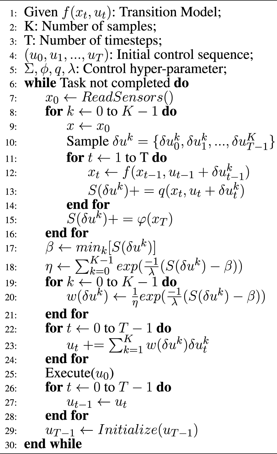 where K is the number of trajectories, and λ is called inverse temperature. The detailed MPPI algorithm is described in Algorithm 1.