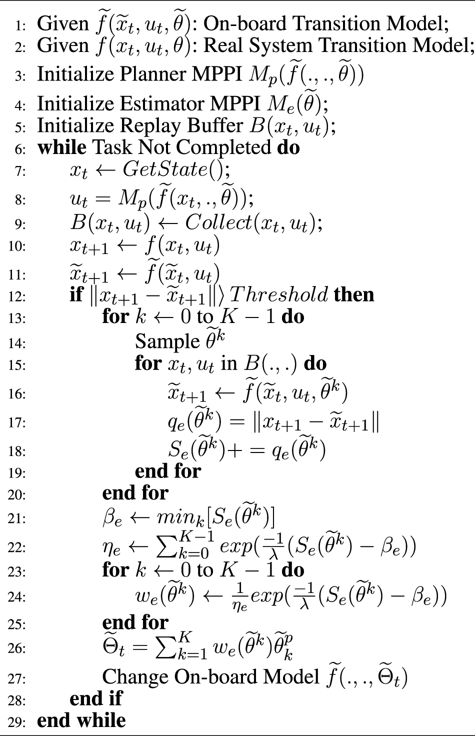 Model predictive control (MPC) is an advanced control method that, similar to model-based reinforcement learning, uses a system model to predict the system’s future behavior. MPC solves an online optimization algorithm to find the optimal control action that drives the predicted output to the reference. One of the state-of-the-art model predictive control techniques is Model Predictive Path Integral Control (MPPI) (Williams et al., 2016). Being sampling-based and derivative-free makes MPPI an ideal candidate for convex and non-convex constraints, where gradient-based model predictive controllers suffer significantly (Williams et al., 2017b; Dixit et al., 2019). Moreover, MPPI’s performance depends considerably on the number of trajectories sampled using the on-board model, and the embedding computation can benefit from recent advances in Graphics Processing Units (GPUs) to achieve better real-time performance. It means one can adjust MPPI performance in real-world applications by selecting suitable processors (Arruda et al., 2017; Kim et al., 2022). MPPI has been used to control aerial and terrestrial robots (Williams et al., 2016; Pravitra et al., 2020). Various algorithms have been proposed to enhance MPPI performance. For example, the authors of (Lowrey et al., 2018) proposed combining MPPI with the concept of value function from model-free reinforcement learning to enhance the MPPI exploration phase. In some works, researchers worked on making MPPI robust to disturbances. In Williams et al. (2018), proposed Tube-MPPI by combining Tube-MPC and MPPI. The result was a robust algorithm that managed cost functions with discontinuous and sparse gradient information. In Gandhi et al. (2021), Gandhi et al. developed Robust MPPI (RMPPI) and investigated its performance on off-road navigation. The algorithm outperformed MPPI and Tube-MPPI in terms of agility and robustness to disturbances. Besides not being robust to disturbances, conventional MPPI’s performance is sensitive to the on-board model, an approximate model of the real system. Structural uncertainties like actuator specifications and lack of environment information like debris inertia can reduce MPPI’s performance. In Pravitra et al. (2020), authors combined MPPI control with L1-adaptive control, resulting in a multirotor controller which was robust to the changes in the system dynamics. L1-adaptive control robustified the architecture; therefore, the overall system behaved similarly to the nominal system with MPPI. In this paper, we propose Planner-Estimator MPPI (PE-MPPI), a novel planner-estimator framework based on the MPPI algorithm, which can handle the model’s uncertainties by minimizing the norm of the difference signal. When the on-board model cannot track the real system and the resultant error becomes greater than a threshold, PE-MPPI readjusts the on-board model parameters. The proposed framework will be further discussed in section V.