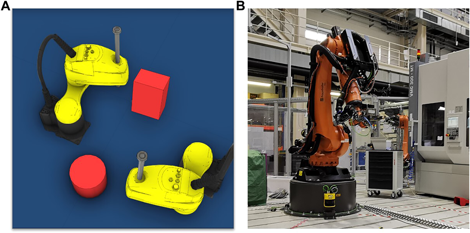 In this application, two SCARA robots perform pick-and-place tasks in different environments containing static and dynamic obstacles. It is important to note that although this application contains two SCARA robots, only the motions of one robot need to be planned, and the other robot is seen as a static or dynamic obstacle. Table 1 details the static and dynamic obstacles in four different categories of environments. In this application, we focus on evaluating the offline planning phase. Thus, the planned motions are only verified in the simulation environment (Figure 5A).