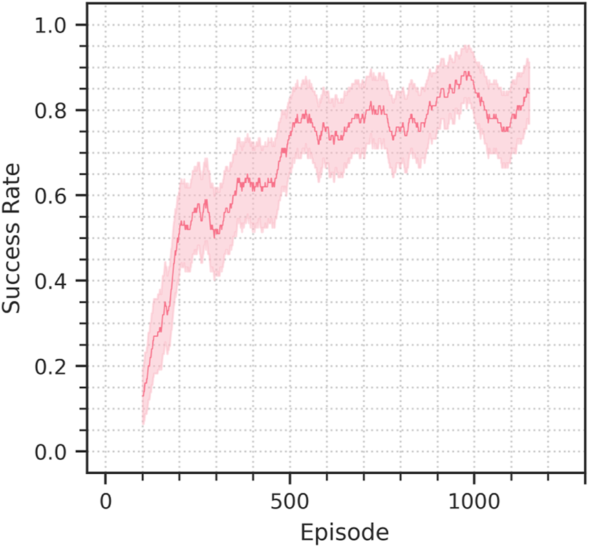 Each episode lasts 40 steps. Once the cube reaches the target position, within a 5 cm tolerance, the episode is considered successful, but it is not interrupted until the 40 steps timeout is reached.