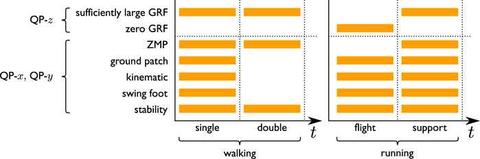 Although the ZMP is not defined during flight phases due to the loss of contact with the ground, balance during support phases can still be enforced by means of a ZMP criterion. ZMP-based approaches for running are proposed with VH-IP modeling of the dynamics during support phases and a free-falling mass model during flight phases (Kajita et al., 2007; Takenaka et al., 2009b; Tajima et al., 2009). The vertical motion is generated independently, the ZMP trajectory is preassigned and the CoM trajectory is obtained by numerically solving the dynamics in order to meet the next step boundary conditions. Englsberger et al. (2016) generate running gaits aimed at approximating natural human behavior, using measured data and a spatially independent polynomial encoding of the CoM trajectory. More recently, Ahn and Cho, (2021) proposed an MPC formulation for executing jumping motions where the vertical trajectory is generated offline. Also, Sugihara et al. (2021) introduced another ZMP-based MPC approach to generate 3D walking and running; constraints are enforced approximately in order to obtain closed-form solutions to speed up the execution.