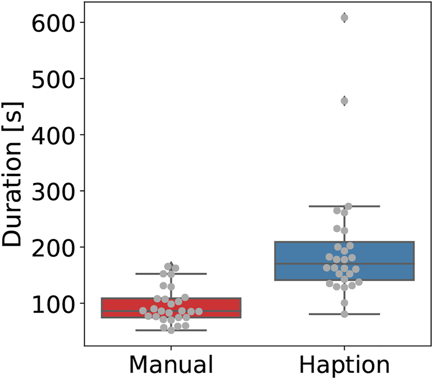 Experiments were conducted as described in Section 3.3. Seven test subjects participated in the experiment, six of them being trained remote handling operators and one novice user; this number was representative of the number of available remote handling operators on site. All the test subjects had experience with robots and teleoperation systems, such as the MASCOT system (Hamilton and Preece, 2001) used during operations in the Joint European Torus (JET) (Sanders, 2006) project. All the test subjects had training and experience using the haptic device and had a familiarisation period with the robot holding the sensor probe. All the test subjects managed to perform the radiation surveying task using both manipulation methods (i.e., they manipulated the sensor probe and found contaminants in the glovebox workspace). Only one iteration of the test had cross-contamination of the probe (i.e., the probe was in direct contact with the LS1 liquid), leading to resetting the test after appropriately cleaning the probe; this instance occurred during one tele-manipulation trial. The task metrics introduced in Section 3.3.4 were used to compare task performance between manipulation methods with two sample t-tests (Delacre et al., 2017). Table 1 shows the resulting task metrics averaged per manipulation method, and a more in-depth explanation of these results is provided next. Furthermore, these results are shown using boxplot figures (Figures 4–7) to express how sparsely distributed the answers were, compared to the average results.