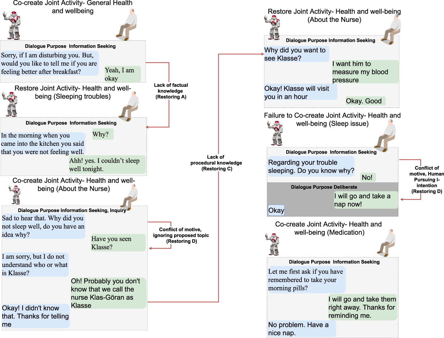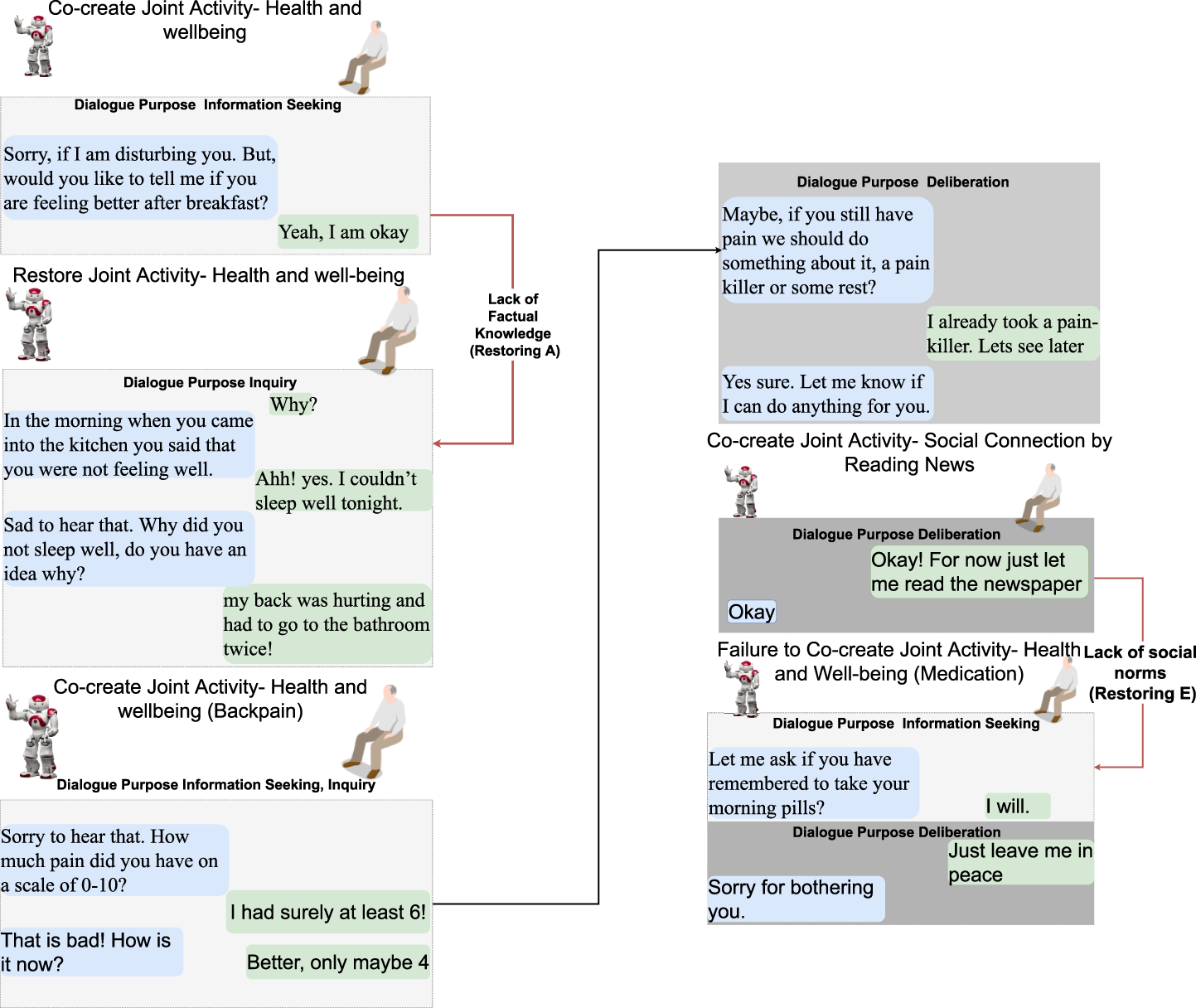 H enters the kitchen, and R initiates a dialogue with the purpose of seeking information about general well-being. When H responds that he/she is not feeling well, R tries to continue the dialogue with the purpose to seek information about the reason. H rejects the proposed topic and instead initiates a deliberation dialogue, asserting that breakfast is the preferred intervention to improve his/her well-being. This situation of conflicting motives of activity is resolved by R when approving H’s deliberation proposal (indicated with a red arrow). Later, H wants to read the newspaper and initiates an information-seeking dialogue with R on the location of the newspaper.