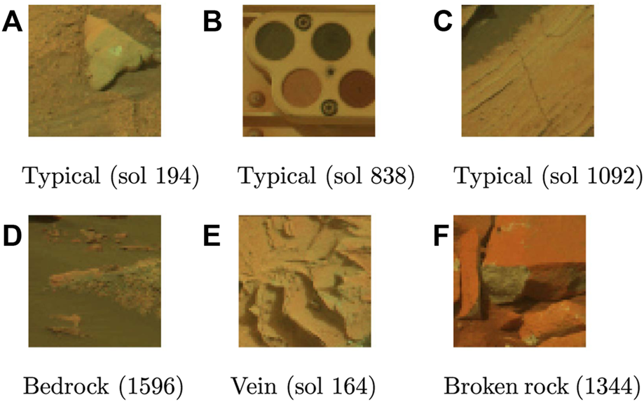Images from the Curiosity Mastcam dataset; (A–C) shows typical images, (D–F) shows novel images. All images in this dataset have a height and width of 64 pixels with six spectral channels. For viewing purposes, only the first three channel are shown.