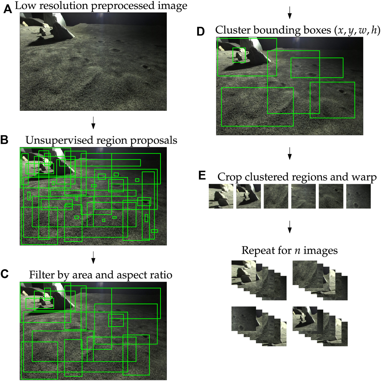 For completeness, the process by which the Lunar Analogue cropped regions were produced is described here, and shown in Figure 2. Region proposals within a landscape image of the Lunar Analogue data were based on saliency detection using the binarized normed gradients (BING) method, pre-trained on PASCAL VOC 2007 to be receptive to generic image features such as edges and textures (Cheng et al., 2019). This algorithm was designed for high frame-rate saliency detection in videos, so it is well-suited for the domain of planetary exploration where computational cost is a primary concern. Examples of region proposals resulting from BING are shown in Figure 3.