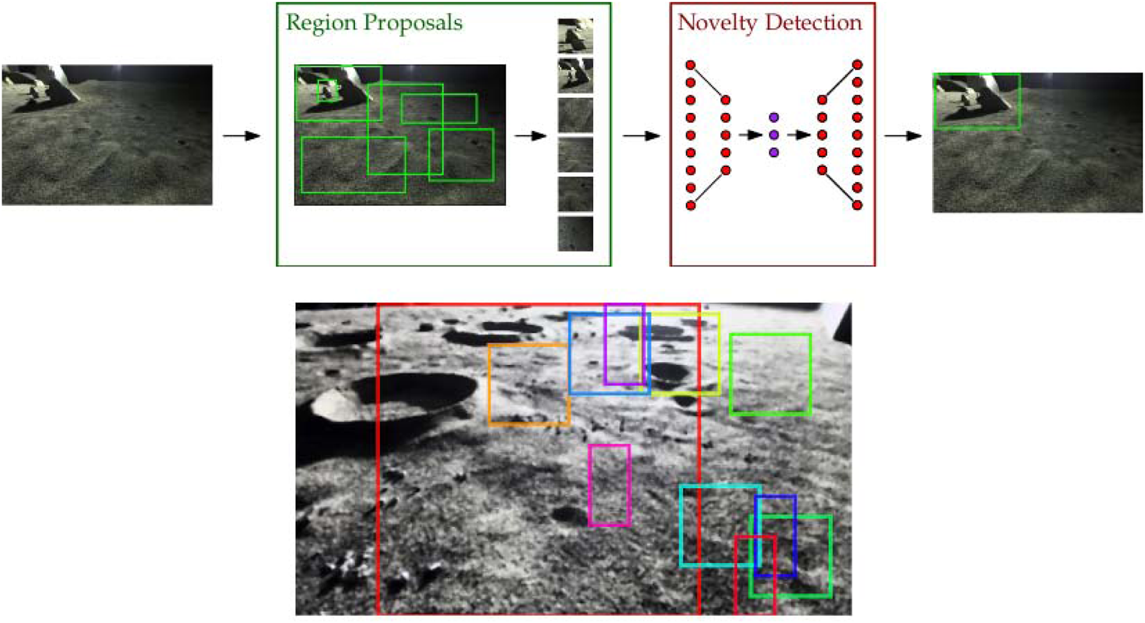 In the past 20 years, exploration missions to the Moon and Mars1 have borne abundant, high-resolution images (among other data products) to the research community, paving the way for future exploration to be conducted more autonomously and more robustly. Several factors are increasingly driving the need for autonomy in planetary science operations. In Mars rover operations, visual surface investigation and decision-making currently takes place in day-long tactical cycles with a desire for faster turnaround Gaines et al. (2016). Upcoming commercial lunar rover missions will have short lifetimes and severely constrained bandwidth shared across several payloads. This will result in a need for rapid tactical decision-making processes with limited or even omitted data Raimalwala et al. (2020). In the domain of planetary exploration, bandwidth is a scarce resource and high cadence telemetry is not always (perhaps even rarely) practical. Autonomous onboard novelty detection offers a way to prioritize data downlink and, in the future, achieve autonomous science targeting altogether.