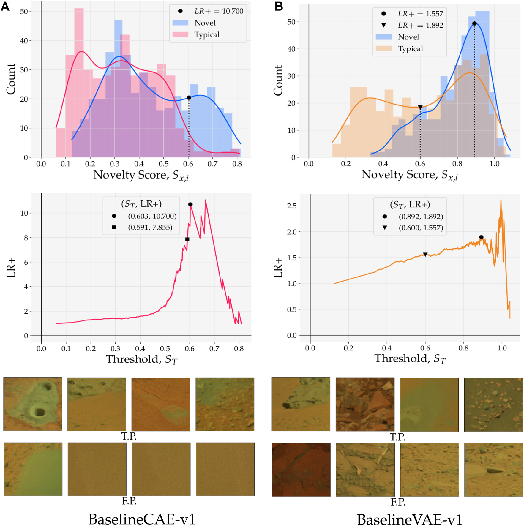 The main contributions of this paper include autoencoder implementations that outperform state-of-the-art methods by on a dataset from NASA’s Curiosity rover’s Mastcam. We also introduce the first (known) implementation of both a VAE and an AAE to the field of rover-based planetary novelty detection and gauge their performance against CAEs. We identify specific operational applications where the different types of autoencoders are most useful by investigating their predictive capabilities in terms of recall and precision, probability of detection, and statistical metrics for model selection, when possible expanding the analysis to the viability of such models in an operational setting. We introduce a new metric, precision at capacity, for novelty detection in bandwidth-constrained applications. Details of algorithmic methodology and a code repository are also contributed.