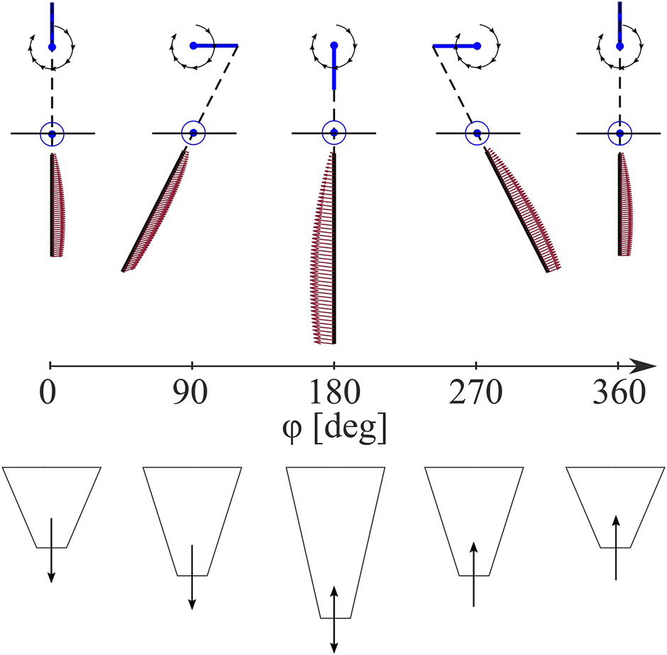 Anisotropic Leg Trajectory. Leg spatial position in black lines and force distribution in red arrows (top) and leg extension (bottom) depicted throughout a burrowing sequence from a leg pose of ϕ = 0–360° relative to full retraction.