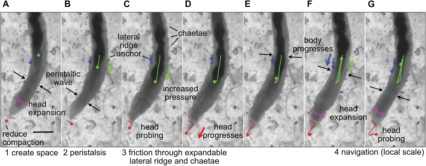 Image sequence of the polychaete worm, Thoracophelia mucronata, burrowing in cryolite grains, a transparent sand analog. (A) The worm expands its head (magenta arrows), reducing compaction of sand in front of the head (tip marked with red dot), as (A,B) a wave of contraction (black arrows) moves anteriorly in direct peristalsis. (B–D) The worm anchors its posterior region by expanding balloon-like appendages on both sides of the 11th segment, called lateral ridges (blue), and extending hairs called chaetae from other segments to increase friction (C,D) Segments posterior of the lateral ridge contract to push the gut (darker color, marked with green) forward, increasing pressure in the anterior region of the worm to push the head forward. The tip of the head probes (C,G) to find the easiest path forward through the sand grains. Colored dots show the location in the current frame of the tip of the head (red), anterior point in the lateral ridge (blue) and anterior point in the gut that can be seen through the body wall (green), and lines in (B–G) show the tracked progression of that position from image (A). Modified from Figure 4 of Dorgan (2018) with permission.