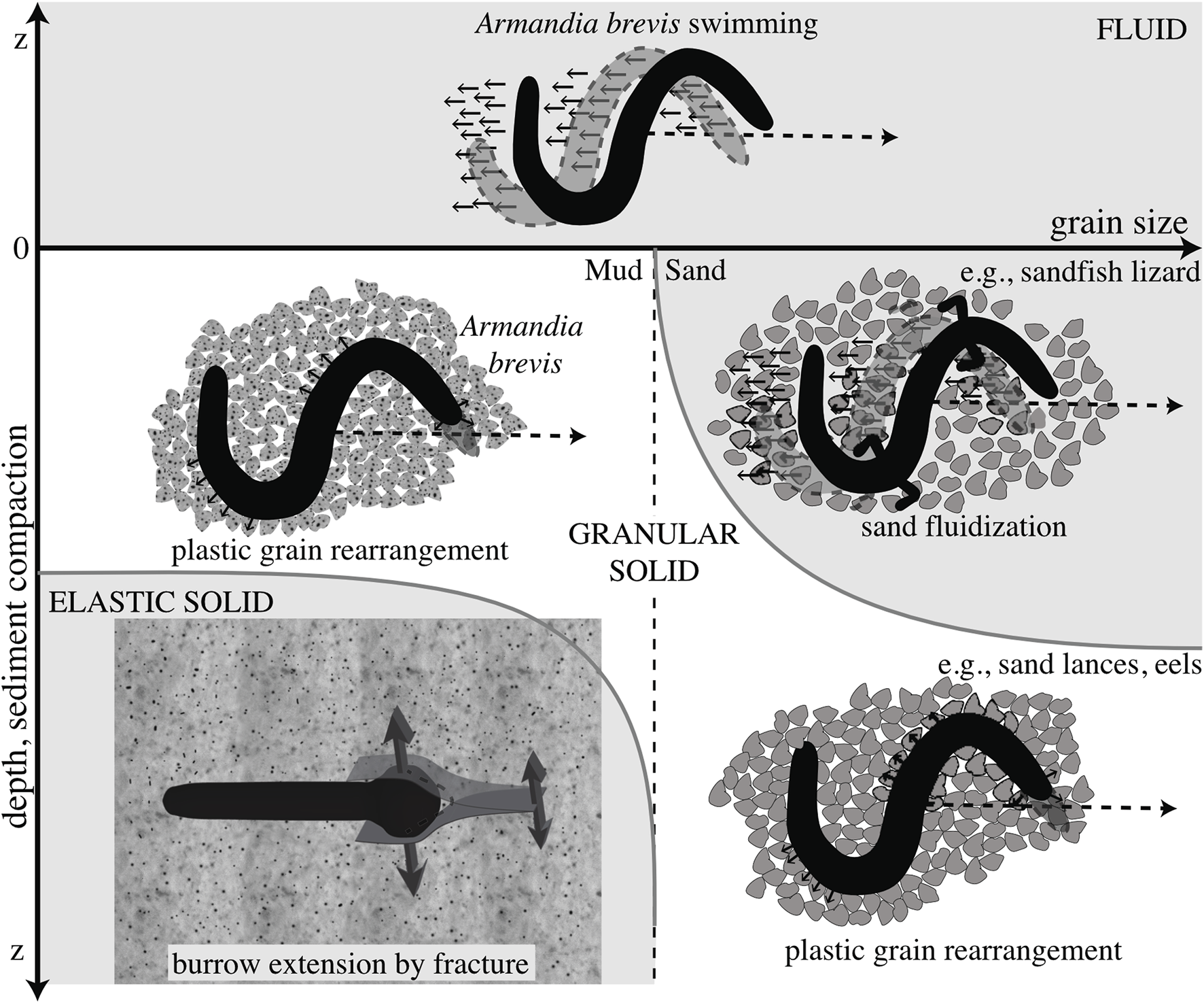 Schematic diagram of different mechanisms of burrowing in idealized muds (left) and sands (right). Dotted line indicates a later time, and the differing mechanics of the media are indicated. Swimming through a fluid is distinguished from plastic grain rearrangement of granular solids in that the body slips backwards in fluids but follows a path without slipping in solids. These mechanisms are distinguished from burrowing by fracture in elastic muds. Reproduced from Dorgan et al. (2013) with permission.