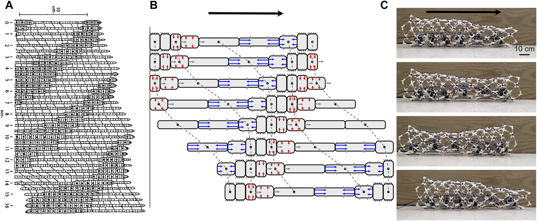 (A) Drawing of peristaltic movement by an earthworm showing narrow segments moving and dilated segments anchoring. Reproduced from Gray and Lissman (1938). (B) Diagram of simplified peristalsis mimicking an earthworm but with fewer segments. Anchored segments are indicated by black lines extending; also shown are segments in which circular muscles (red) are contracting to elongate the segment (against a posterior anchor), and those in which longitudinal muscles (blue) are contracting to shorten the segment (against an anterior anchor). In both diagrams, peristalsis is retrograde (the wave of contraction travels posteriorly), and segments have a constant volume (assuming a cylindrical shape in B). Dots connected with dashed lines show the same segment in multiple frames. (C) These peristaltic motions can be duplicated in robots, as in CMMWorm (images by K. Daltorio).