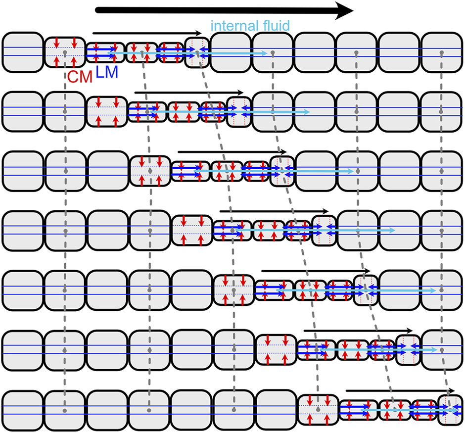 Diagram of direct peristalsis, following peristalsis by Thoracophelia mucronata (Figure 2). The wave of circular muscle contraction travels toward the head, starting with contraction of the circular muscles (CM; red) to reduce the diameter, then contraction of the longitudinal muscles (LM; blue) to pull the narrow segment forward. Internal fluid (cyan) moves between segments, e.g., being pushed forward as the contractile wave moves forward.