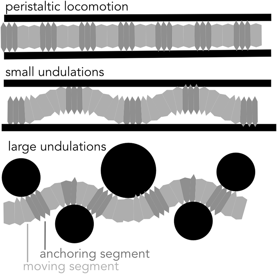 Diagram of peristaltic and undulatory movements. Soft-bodied burrows create anchors to generate thrust in a cylindrical burrow using peristaltic expansions and small undulations. Larger undulations result in a meandering path and are effective in moving around obstacles.