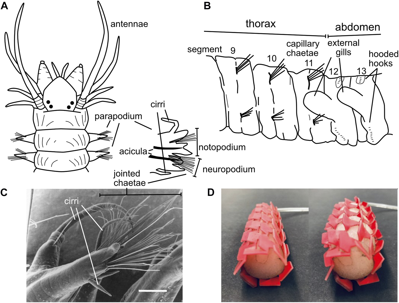 Dividing burrowing into these components allows deliberate examination of how animals and robots use different structures and behaviors to solve these problems. For example, the worm, Thoracophelia mucronata (Figure 2), uses fundamentally different mechanics to create space to move forward from the animals in Figure 1, but moves forward in similar ways. The expansible lateral ridge and chaetae provide anchoring, and the alternating contraction of circular and longitudinal muscles create direct peristaltic waves for forward motion (Dorgan, 2018). Scaling differences and environmental constraints affect these problems differently, with animals using different strategies depending on body size, sediment type, and evolutionary history (Dorgan, 2015). Additionally, these problems may vary in their importance for different engineering applications, e.g., burrowing through harder substrata may require greater emphasis on creating space, whereas if precision in locating a target is important, then navigation may be a bigger challenge. We argue that solving these four problems should allow a robot to burrow effectively, i.e., to make forward progress through soils or sediments.
