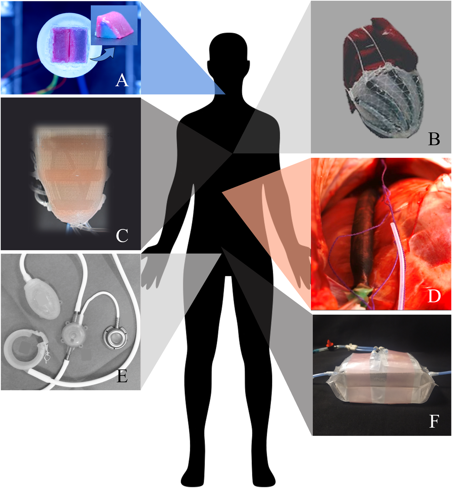 The reported considerations and the state-of-the-art examples undeniably highlight the great potential of soft robotics in the advancement of implantable assistive devices and artificial organs. At the same time, definitive solutions are still needed for several big challenges and multidisciplinary research is recognized as the key to tackling such complex problems. The broad research that has been conducted in the last 10 years on high-fidelity organ simulators is recognized as pioneering, not only for the understanding of human pathophysiology (Figure 2A) but also for the development of artificial devices for organ replacement. Indeed, the fundamental research on building blocks, such as material chemistry and actuating elements, and the realization of a synthetic organ simulator can, at least, bring very close to an artificial organ. Nevertheless, additional multidisciplinary efforts are still needed for implanting soft artificial organs that are proven to be effective, safe, and long-lasting, finally making the possibility of clinical translation real. To give a future perspective, soft robotics artificial organs and assistive devices will have a role in the sustaining or substitution of those human body functions that are almost purely mechanical. In Figure 2, we show some examples of the most advanced implantable soft robotic devices that were developed to sustain the blood pumping (b, c), the diaphragmatic movement involved in respiration (d) and the sphincteric (e) and the excretory (f) action.