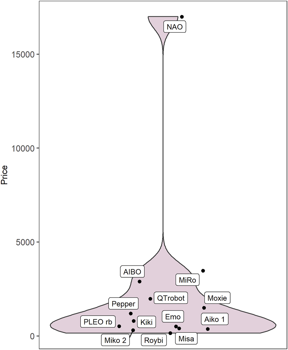 On the whole, robots that met all criteria for inclusion were frequently mentioned in our web searches (occurring in 26.7 unique web results on average), while excluded products were mentioned less frequently (3.6 results). Twenty-one robots met our inclusion criteria. They were manufactured in the United States (n = 6), Japan (n = 4), China (n = 3), France (n = 2), Spain (n = 2), and India, Luxembourg, Taiwan, and the United Kingdom (n = 1 each). Where it was possible to identify robot prices from manufacturer’s websites (13 of 21 robots), they ranged from 150 to 17,000 USD, with a median price of 799 USD (Figure 2).