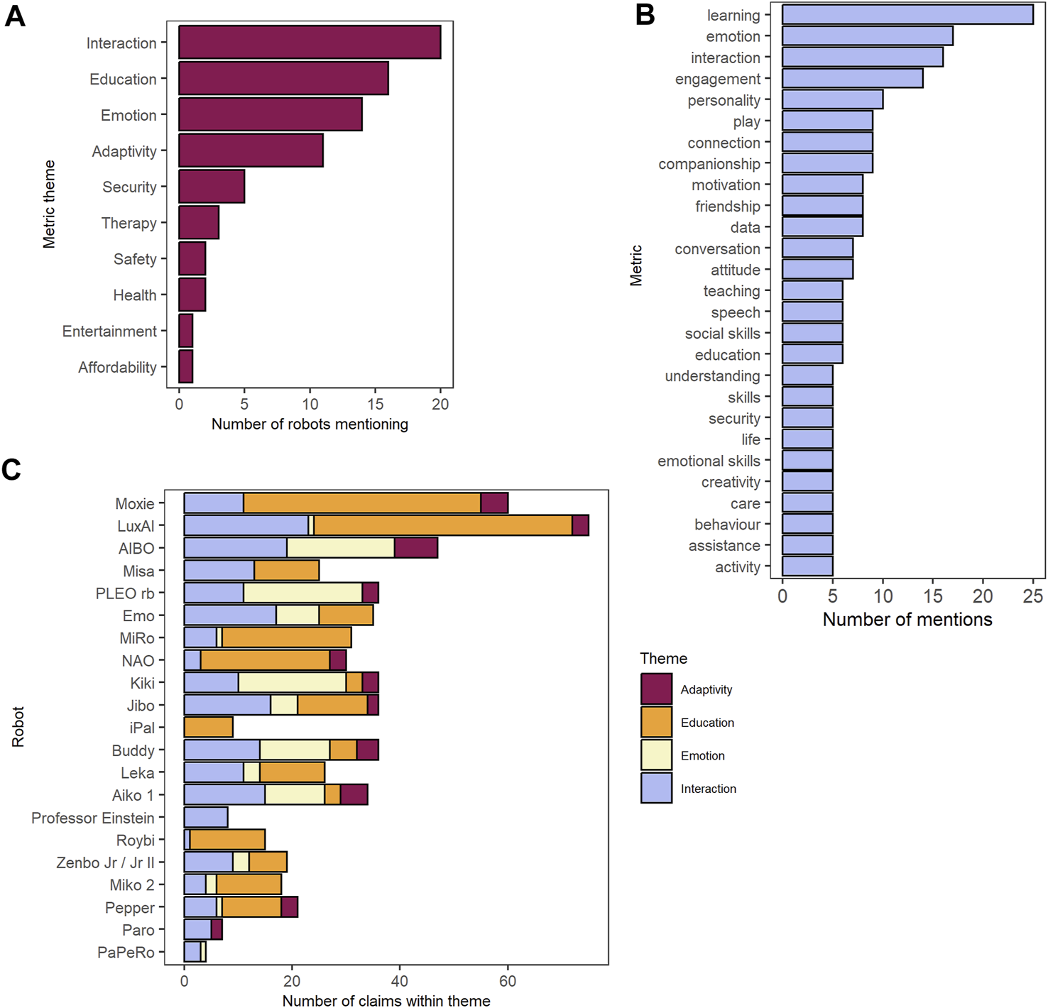 (A) Number of robots mentioning each metric theme at least once. (B) Metrics occurring for five or more claims. (C) Number of claims per robot for each of the four most common metric themes.