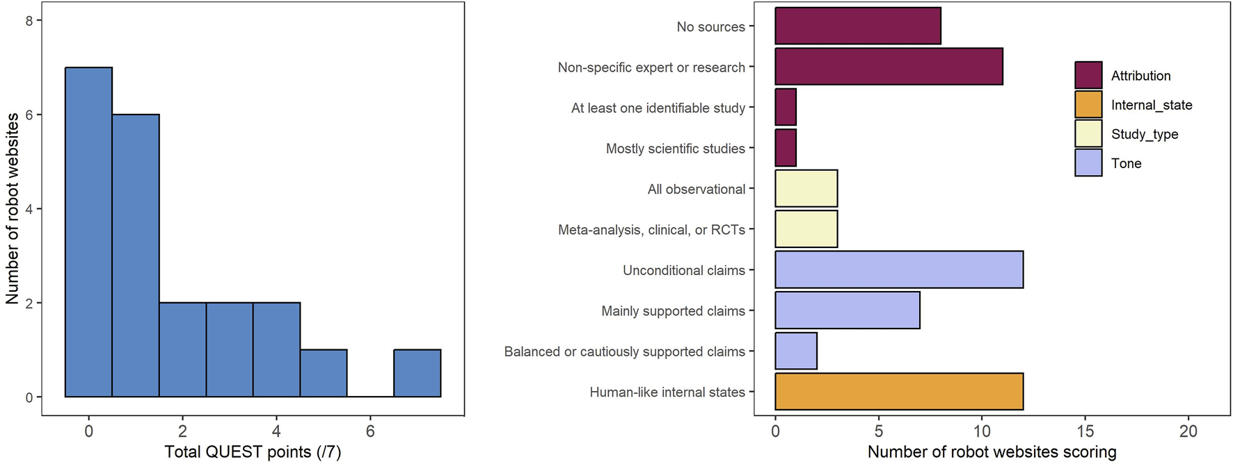 Finally, while not part of the QUEST instrument, we also coded websites for the presence of language attributing human-like internal states like emotions or motivations to the robot. We found these types of statements on 12 of 21 websites. Examples included: “A robot that understands how you feel and cheers you on…,” “He will be happy to give you a warm welcome to come home to ,” [the robot] “loves making friends and is a naturally inquisitive robot,” “Loves you back” [all italics by the authors].